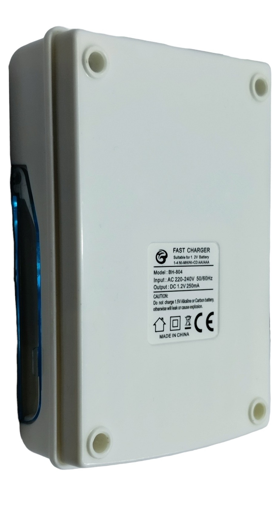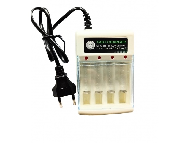 Cargador para pilas Ni-Mh 1.2V Para 4 pilas AA o AAA Entrada de voltaje: AC 220 - 240V 50/60Hz Salida de voltaje: DC 1.2V 250 mA Dimensiones: 10.2x7x2.8 cm