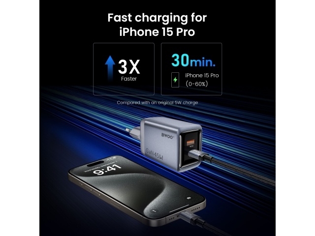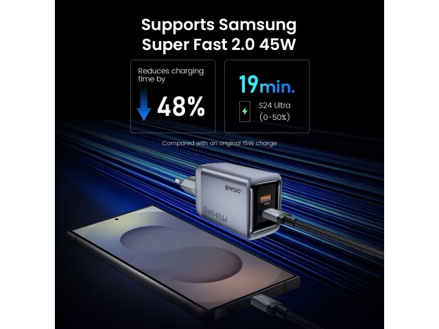 Carga rápida PD de 45 W: Energía de alta velocidad para teléfonos, tabletas y portátiles con USB-C.