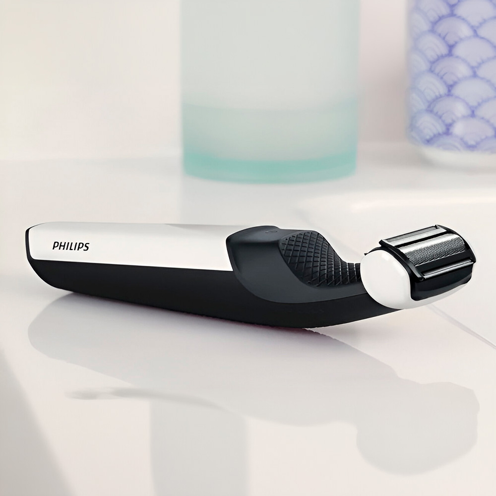 Respetuoso con la piel: el cabezal de la afeitadora cuenta con puntas redondeadas patentadas y una lámina hipoalergénica para proteger la piel de cortes y rasguños durante el afeitado.