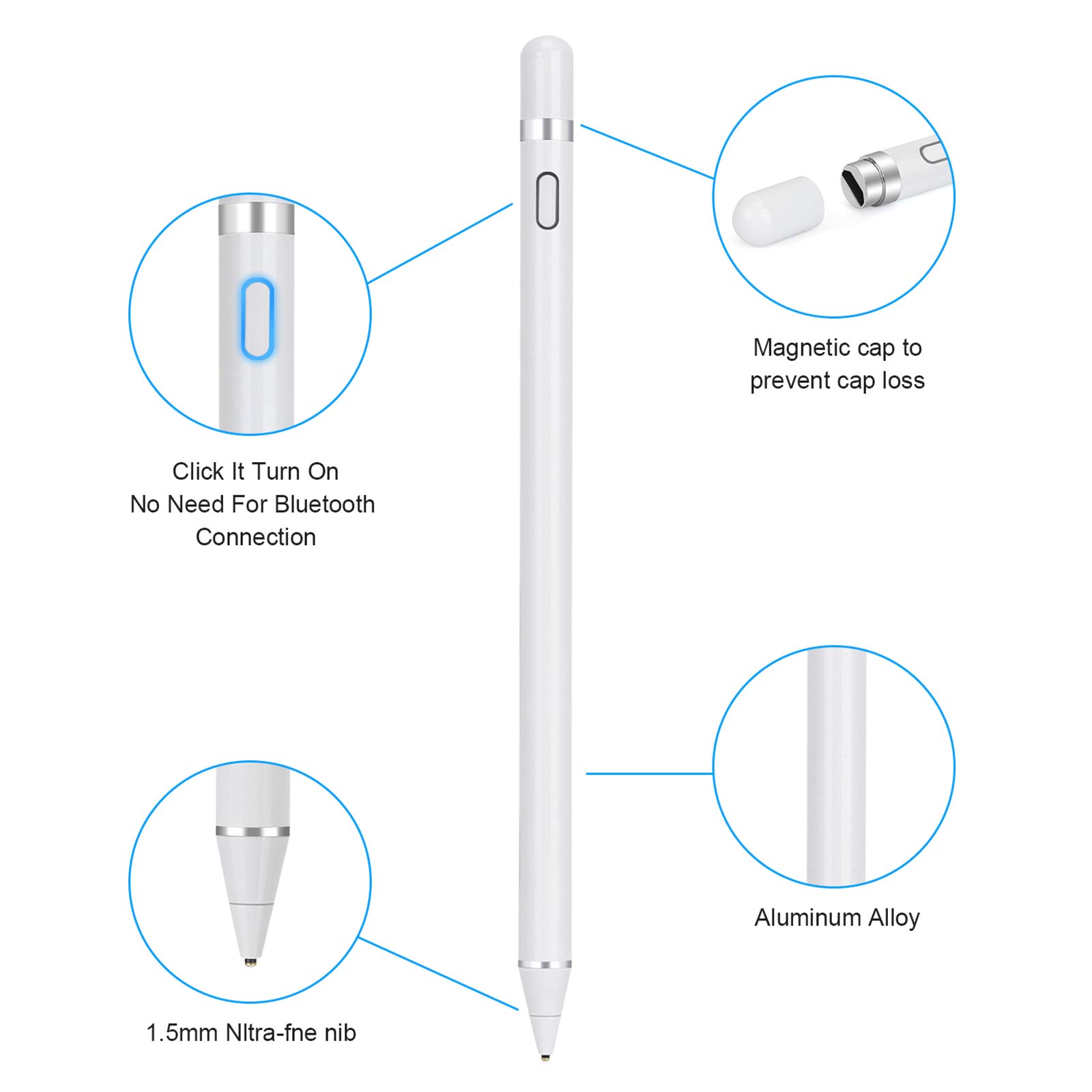 Función de apagado automático de 30 minutos y batería larga: configuramos la función de apagado automático de 30 minutos en la inactividad del lápiz. El puerto de carga micro USB del lápiz activo, con batería de litio en el interior, se puede utilizar continuamente durante aproximadamente 8-10 horas