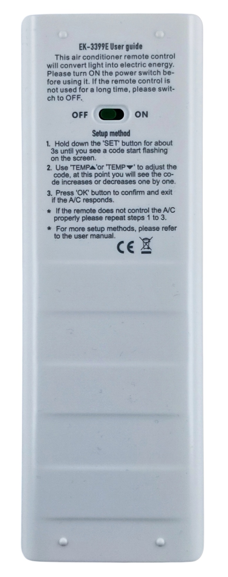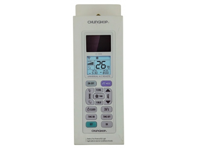 El EK-3399E es un control remoto para aire acondicionado que convierte la luz en electricidad. Incorpora un condensador de almacenamiento y no necesita pilas secas tradicionales. Basta con colocarlo junto a una ventana o balcón para absorber la luz. Absorber la luz solar durante 3 o 4 horas puede generar suficiente energía para usarlo durante 3 meses o más. (Nota: No se recomienda exponer el control remoto a la luz solar intensa durante mucho tiempo). ¡Al convertir la luz en electricidad, podrá disfrutar de la maravillosa vida de la energía verde!