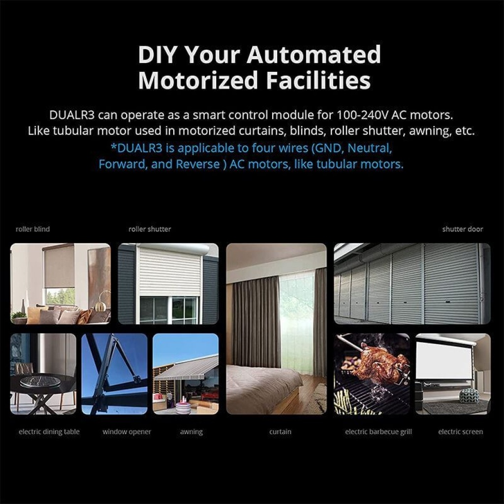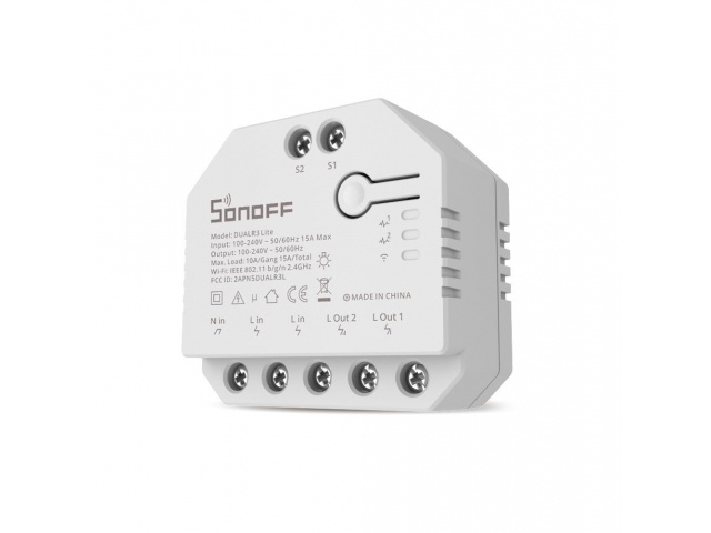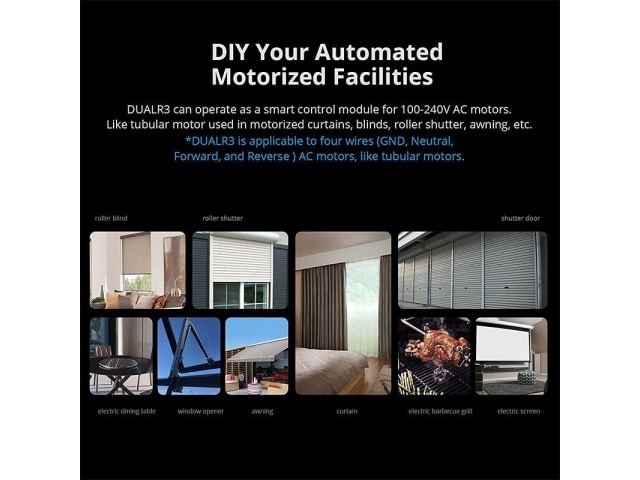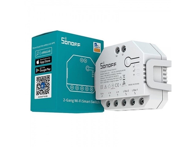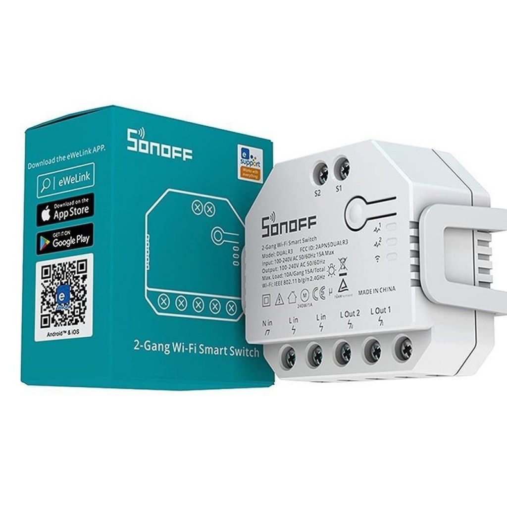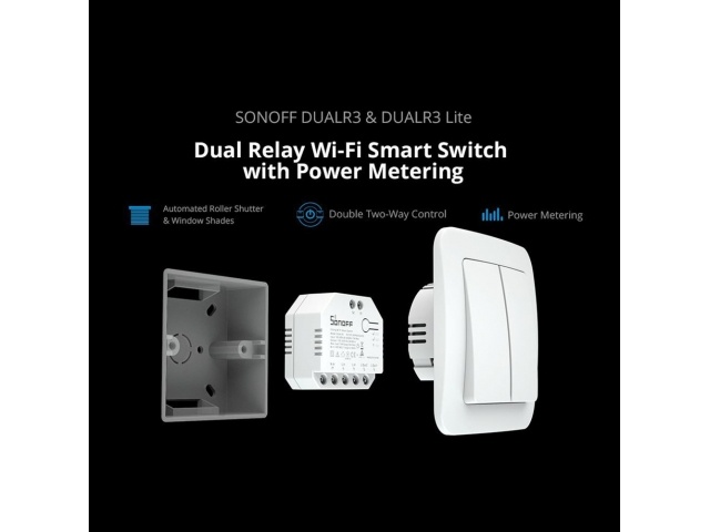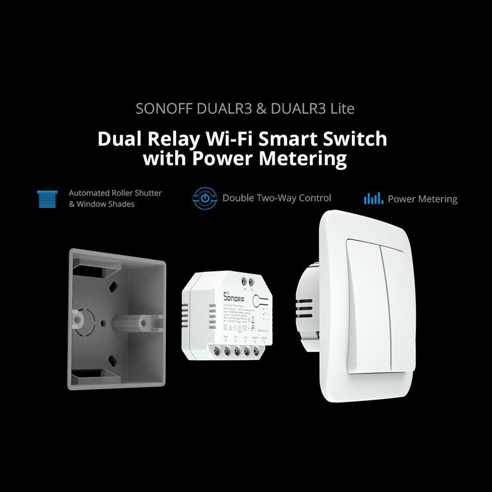 DUALR3 es un módulo de interruptor de relé dual inteligente Wi-Fi empotrado que se instala detrás de cualquier interruptor estándar para transferirlo a un interruptor inteligente para control remoto inalámbrico con dispositivos móviles o comando de voz.